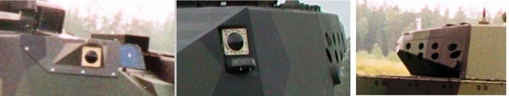 Пушка представлена шведской фирмой RUAG de Thun. Эта гладкоствольная пушка оснащена тормозом отката и эвакуатором копоти. Данная пушка разрабатывалась в 70-х годах для вооружения перспективного шведского танка, не просуществовавшего и дня. Он простоял в бездействии около 20 лет, прежде чем к нему проявили интерес благодаря его компактности и небольшой массе. Добавление тормоза отката заинтересовало создателей легких башен, поскольку уменьшилась сила отдачи. Приводы наведения автоматизированы, они позволяют вращаться башне на 360° и поднимать пушку от -8°до +22°. Это вооружение обеспечивает свободное ведение огня. В распоряжении стрелка находится прицел UTAAS (Универсальная противотанковая и противовоздушная система) с лазерным дальномером и тепловизором. Командир танка использует дневной прицел Thales Optronics с тремя увеличениями (Х1,5; Х6; Х24). Он получает тепловизионное изображение от прицела стрелка. В настоящее время компания Hägglunds предложила укомплектовать СУО панорамным перископом (PLSS) фирмы Saab Tech. PLSS – прибор дневного/ночного наблюдения с лазерным дальномером, с обзором 360°. Именно он позволит полностью реализовать принцип «охотник-стрелок». PLSS приводится в действие командиром танка или заряжающим, на него может быть возложена данная обязанность, пока командир и стрелок выполняют другие задачи. Прежде чем использовать тактические сведения, полученные при помощи различных источников, прицел и электронные контрмеры, каждый из членов экипажа обращается к цветному экрану, на которых дано точное изображение наблюдаемых объектов, изучает данные навигационных систем и картографию, определяет боевую готовность (связь противника, оружие массового поражения, ведение огня противником). Экраны и датчики образуют единую сеть. Данная конструкция позволяет провести автотестирование систем, в том числе и периферических. 1. CV 90-120 – вид сзади. 2. Компания Hägglunds создавала CV 90-120 на экспорт, при этом, надеясь привлечь внимание шведской армии для оснащения ее нордланских бригад, предназначенных для ведения боевых действий в трудных северных условиях, для которых танк STRV 122 (Leopard 2) слишком тяжел 3. Размещение боекомплекта CV 90-120. 4. Дульный тормоз типа "pepper pot" производит большой огненный шар во время выстрела Электронная защита танка была разработана компанией Celsius Tech et Grintek Avitronics. Детекторы лазерного облучения с четырьмя датчиками, установленными по углам башни и созданными фирмой Thales Optronics, информируют экипаж о направлении, откуда производится лазерное облучение, после чего танк может применить помехи либо подавить обнаруженную цель огнем. И, наконец, радар сообщает экипажу о том, не замечена ли машина противником (РЛС), в данном случае необходимо будет изменить тактическое положение и найти другой природный или искусственный экран. Рис. 12. Электронная защита танка была разработана компанией Celsius Tech et Grintek Avitronics. Лазерный детектор наблюдения с четырьмя датчиками, установленными по углам башни и созданными фирмой Thales Optronics. Пусковые установки многоспектральных аэрозольных гранат установлены в контейнерах на кормовой части башни (на последних образцах). Рис. 13. CV 90-120 оснащенная комплексом снижения заметности и радаром. Радар, установленный на крыше, отслеживает возможную атаку с воздуха, артиллерийские снаряды и снаряды минометов. Сеть датчиков п