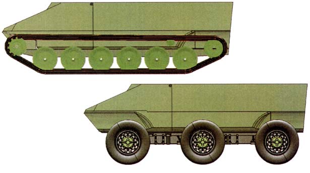 В списке задач, которые машина должна выполнять, нет ничего оригинального, в требованиях шведской армии тоже. Весь интерес к SEP заключается в том, что над данным проектом работает тандем FMV/ Hägglunds. Оперативный анализ, проведенный фирмой FMV, выявил необходимость создания двух типов шасси для SEP: гусеничного и колесного (6×6). Основной довод данного решения – шведские дороги. На севере – болота, вязкие берега озер и огромные сугробы снега, следовательно, на таком грунте лучше использовать гусеничные машины. Для юга больше подходят колесные машины, поскольку они могут больше перевозить, а сеть дорог – более густая. С другой стороны, колесные машины можно использовать в миротворческих операциях. Между тем, применение двух различных шасси слишком дорого для такой страны как Швеция, но политики изыскивают средства, чтобы поддержать отечественную промышленность, которая, как правило, не может позволить себе полное финансирование большинства систем. Это довод, который шведские инженеры выдвинули, чтобы получить средства на разработку двух родственных платформ, одной – колесной, другой - гусеничной, у каждой из версий будет одинаковое оборудование и вооружение: система защиты от оружия массового поражения, система вентиляции и кондиционирования, электрооборудование, обитаемое отделение, вооружение, и, прежде всего, транспортный и функциональный модули. Только у шасси будет своя специфика. Только шасси у версий SEP будут различны, причем их геометрия позволяет говорить о их взаимозаменяемости Один из основных технических принципов фирмы FMV – создание шасси, у которого соотношение полезной и максимальной массы, полезного и максимального объема будет выше, чем у классических бронированных машин. Для сравнения: шведы ссылаются на немецкую машину GTK. Так, у GTK это соотношение составляет от 0,17 до 0,54, у SEP, соответственно, от 0,33 до 0,70. Использование традиционных технологий при создании классического шасси не позволит достичь желаемой цели, с трудом это удалось у М113 и VAB. Шведы нашли выход из этой ситуации, предложив две новые идеи: с технической стороны, гибридный электропривод, легко устанавливаемый на шасси с точки зрения конструкции, и интеграция двух групп привода на ходовую часть, позволяющая освободить внутренний объем машины. Вид сверху. Четко показано расположение в корпусе двух модулей дизельэлектропривода, позволяющих освободить пространство внутри шасси Оригинальность электрического привода SEP заключается в использовании двух