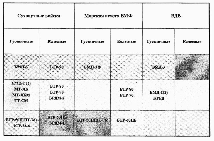 В настоящее время проходят ОКР по модернизации легких бронированных машин: по модернизации гусеничных БМП-2 и БМП-1 – основных боевых машин МСБ; · по модернизации МТ-ЛБ (МТ-ЛБВ) - основной базовой машины для многих образцов ВВТ, в том числе и снегоболотоходных БТР мотострелковых подразделений и частей, дислоцированных на севере, Дальнем Востоке и других ТВД со сложными погодными и дорожными условиями, включающих большое количество труднопроходимой снежно-болотистой местности. В процессе Чеченской войны дополнительно выявились отличные ходовые качества этих машин в условиях горной местности благодаря повышенным сцепным качествам их гусеницы и хорошей управляемости. · по модернизации обширного парка колесных БТР ГАЗ (БТР-80, БТР-70, БТР-60ПБ), благодаря колесному движителю наиболее пригодных к использованию в условиях населенных пунктов, городов, дорог общего пользования и находящихся на снабжении как МСБ СВ, частей морпехоты ВМФ МО РФ, так и ВВ и других спецподразделений различных силовых структур. Все эти базовые машины мотострелкового отделения имеют достаточно большие внутренние объемы десантного и боевого отделений, в которых можно разместить практически все имеющиеся комплексы вооружения батальонного звена. Вследствие того, что образцы существующих машин огневой, инженерной и другой специальной поддержки создавались бессистемно на какой-либо одной из вышеупомянутых баз, в основном на базе МТ-ЛБ и БМД, параллельно с коренной модернизацией собственно шасси базовых ВГКМ ЛКМ необходимо развернуть работу по размещению и модернизации уже отработанного специального оборудования на других базах - БМП и БТР ГАЗ, для обеспечения комплектации этими машинами МСБ и СТБ, имеющими в качестве основного бронетанкового вооружения другие базовые машины БМП-2 и БТР-80. При создании же новых типов ВГКМ необходимо сразу задать их создание на всех базах ЛБМ, включая шасси вновь разрабатываемой БМП и БТР в количествах, соответствующих потребностям укомплектования батальонов, вооруженных новыми базовыми машинами. |