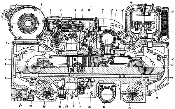 В конце такта сжатия за 19° до в.о.м.т. (или 14° до в.м.т. выпускного вала) топливный насос начинает подачу топлива (точка т на рис. 2 и 3). Впрыск топлива в цилиндр начинается несколько позже. Под действием высокой температуры сжатого в цилиндре воздуха распыленное топливо нагревается, испаряется и вскоре воспламеняется. Горение топлива, начавшееся в конце сжатия, продолжается в начальный период такта расширения. Из диаграммы фаз газораспределения (рис. 3) следует, что 'продолжительность открытия выпускных окон (выпуск) составляет 138° поворота коленчатого вала, а продувочных (впуск) — 118°. Одновременное открытие продувочных и выпускных окон, соответствующее периоду лродугаки, равно 118°. Процесс газообмена рассматриваемого двигателя можно разделить на два характерных периода (рис. 2 и 3): свободный выпуск (выпуск до продувки) —линия в1 — П1. впуск и выпуск (продувка) — линия П1 — в2. 2. УСТРОЙСТВО ДВИГАТЕЛЯ Двигатель 5ТДФ состоит из кривошипно-шатунного механизма, механизма передач, нагнетателя, турбины, систем питания топливом, управления, смазки, охлаждения, суфлирования и запуска. Кривошипно-шатунный механизм двигателя состоит из остова, коленчатых валов, шатунов и поршней. К остову двигателя относятся: блок, корпус передачи, плита турбины, боковые картеры и цилиндры. В блоке 8 (рис. 5) установлены цилиндры 4 и коленчатые валы — впускной 3 и выпускной 16. В каждом цилиндре установлено два поршня — впускной 23 и выпускной 22. Поршни посредством шатунов 11 связаны с коленчатыми валами. Двигатель имеет пять цилиндров.