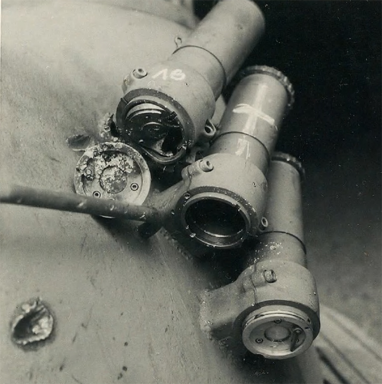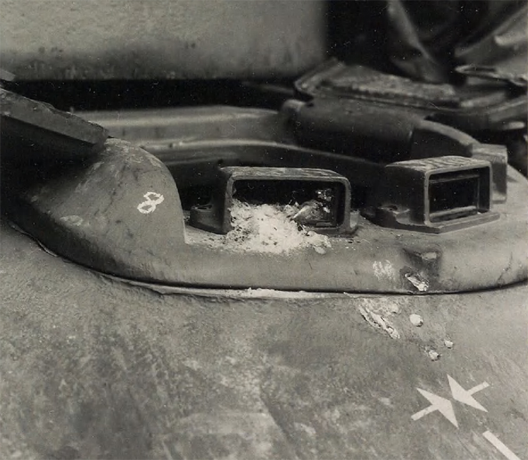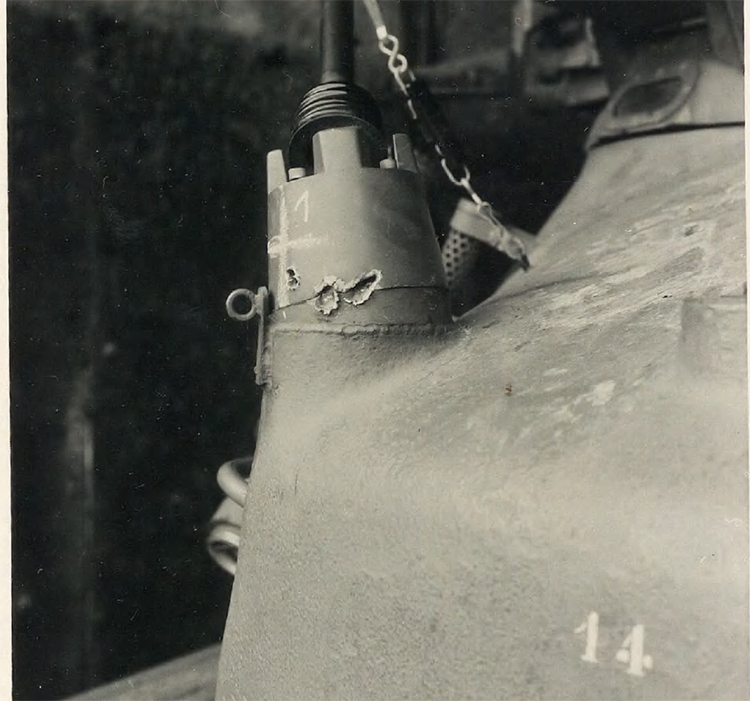 13. 20 mm Flab.Kan.38, Pz.G V/1 выстрел. Д=50 м. Выстрел по люку водителя. Перископ имеет небольшие трещины, но все еще пригоден для использования.