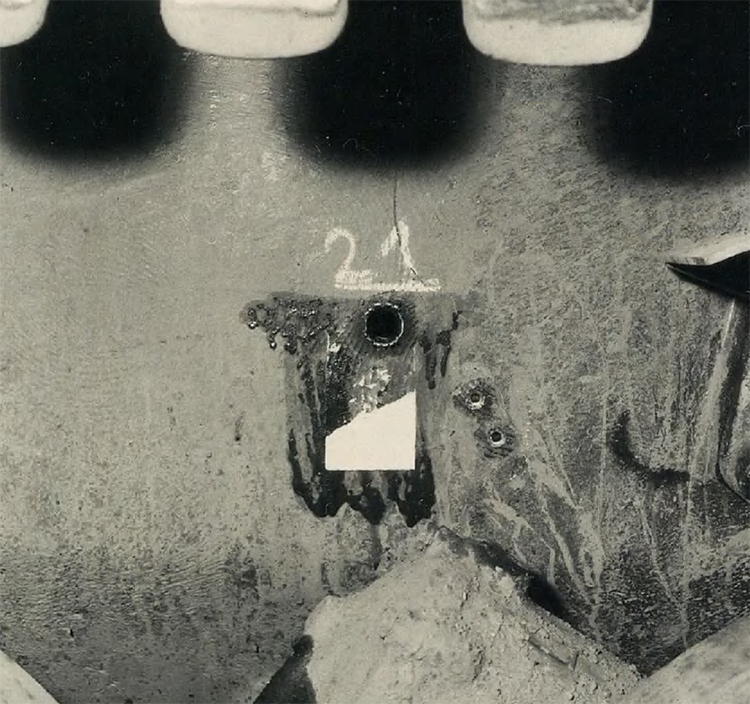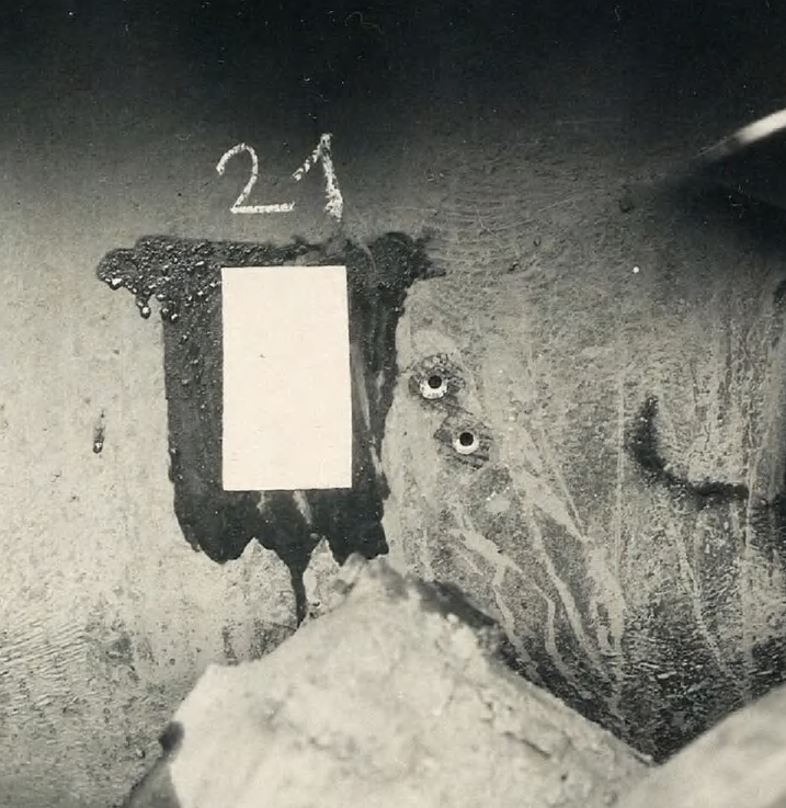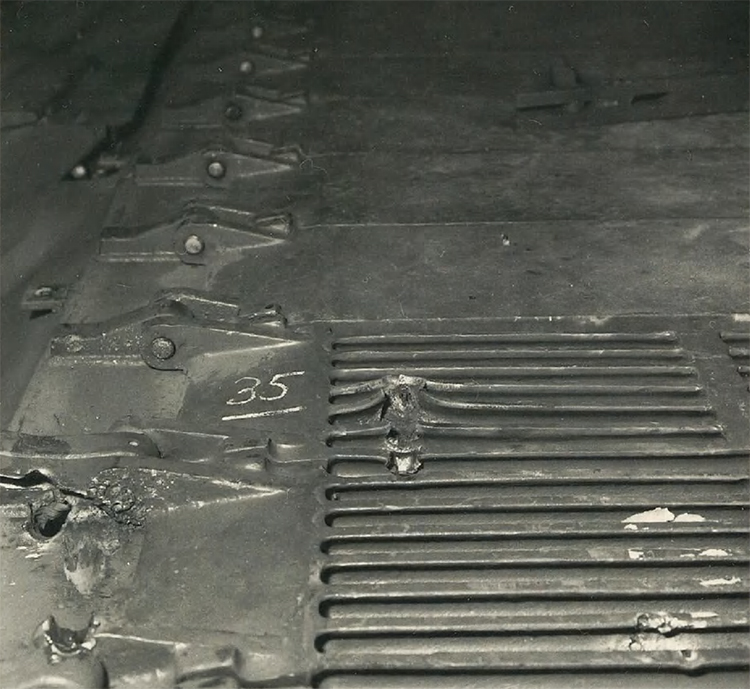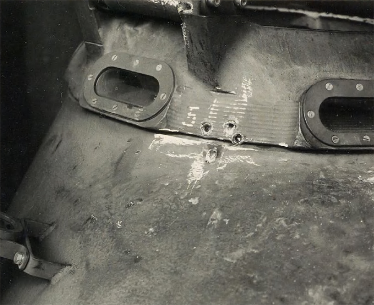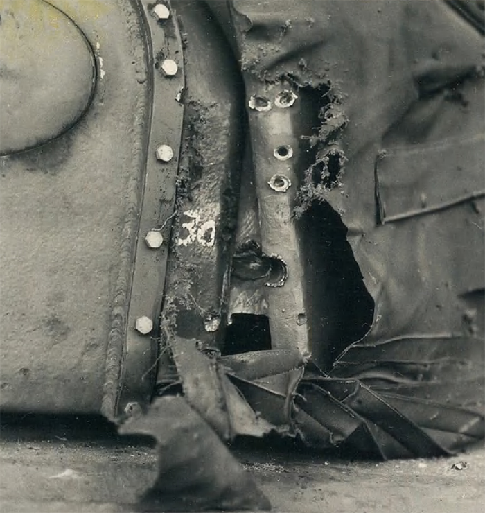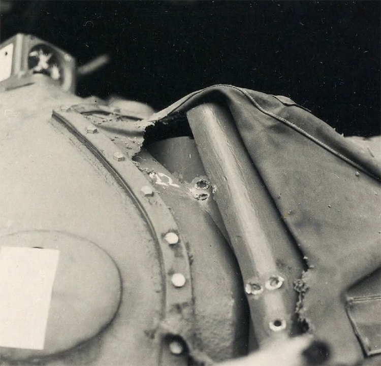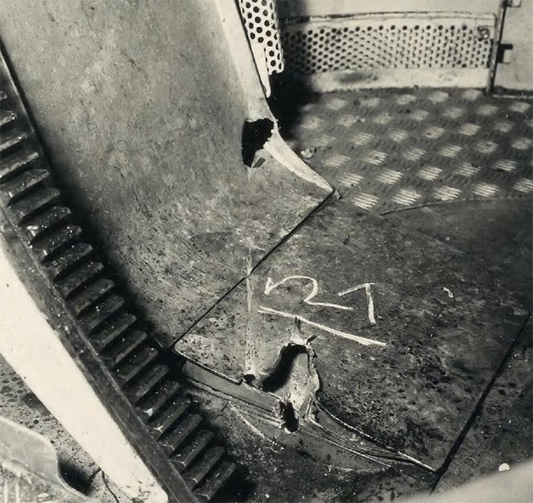 21. 20 mm Flab.Kan.38, Pz.G V/1 выстрела. Д=50 м. Пробитие. Следы от снаряда в полу корзины башни.