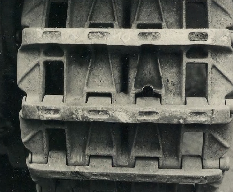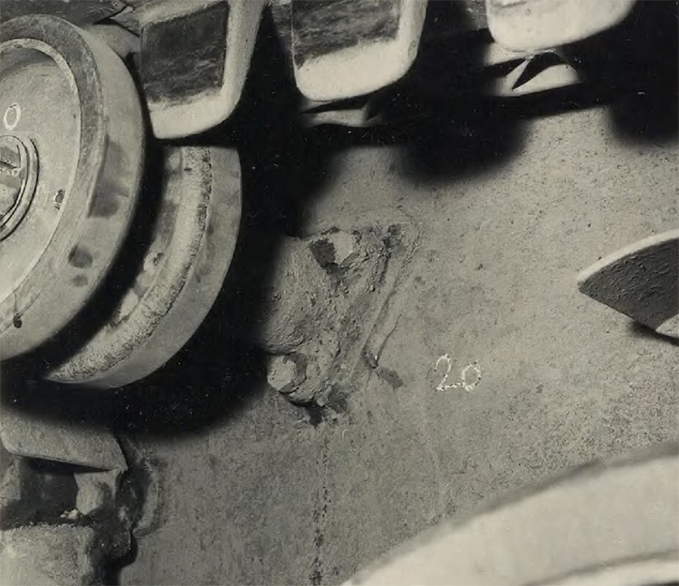 20. 7,5 mm St.Ke.Pat.il ZF Kar./3 выстрела. Д=50 м. Поддерживающий каток продолжает работать, несмотря на то, что крепежная гайка пробита и расклепана.