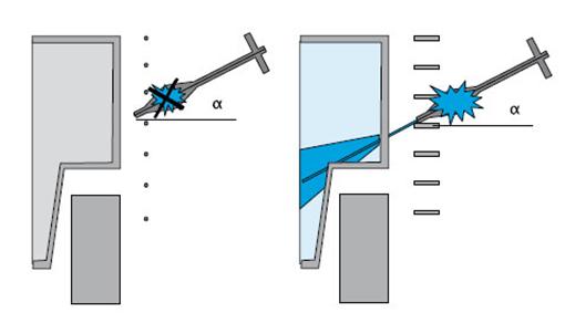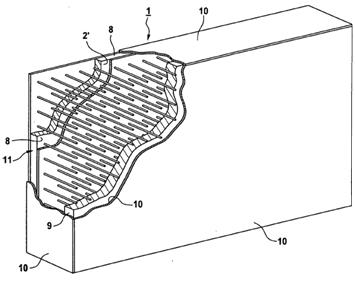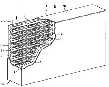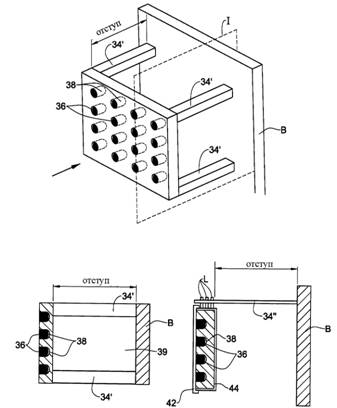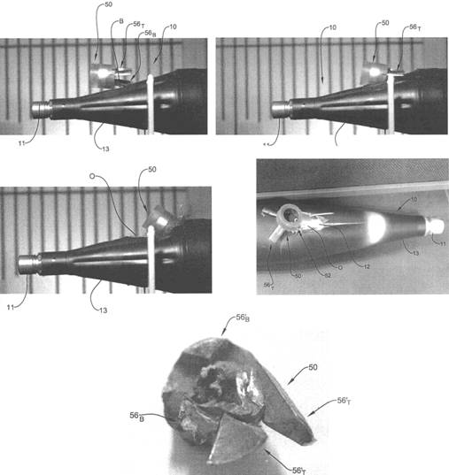 В проведенных экспериментах «тихая нейтрализация» составила примерно 70% результатов всех опытов. Передняя часть броневого модуля изготовлена из пригодного для контурного вырезания полимерного материала с вставленным в него множеством элементов брони и содержит покрывающий слой, предназначенный для покрытия переднего конца передней части и для предотвращения отделения элементов брони. Задняя часть создает отступ между элементами брони и подлежащим защите корпусом. Плотность материала броневого модуля не превышает 250 кг/м3. Этот материал может быть выбран, например, из следующих групп: пенопласты с закрытыми ячейками, пеноматериалы EVA и формованные пеноматериалы. В качестве примера можно привести такие материалы как полученный экструзией полистирен, стирофом, полиэтилен, пенопласт Palciv® и т.д. Покрытие предназначено для защиты модуля от тепла, ультрафиолетового излучения и т.д. Покрытие модуля не предназначено для активизации взрывателя снаряда, а допускает деформацию боеголовки элементами брони до активизации взрывателя. Броневой модуль в перспективе сверху Р атакующее противотанковое средство 30 броневой модуль 32 передняя часть броневого модуля 34 задняя часть броневого модуля 35 множество слоев задней части броневого модуля 36 элементы брони 37 покрывающий слой 38 посадочные гнезда для элементов брони 39 воздушный зазор В подлежащий защите корпус 42 первая покрывающая деталь 44 вторая покрывающая деталь Варианты исполнения броневого модуля Р атакующее противотанковое средство 30 броневой модуль 32 передняя часть броневого модуля 34' стойки для создания воздушного зазора 34'' рейки для создания воздушного зазора L кольца для подвешивания броневого модуля 36 элементы брони 37 покрывающий слой 38 посадочные гнезда для элементов брони 39 воздушный зазор В подлежащий защите корпус 42 первая покрывающая деталь 44 вторая покрывающая деталь Испытания Разработчики указывают, что были проведены испытания броневого модуля, при которых его обстреливали гранатой РПГ, при этом броневой модуль выдерживал удар реактивной гранаты. Однако в этих экспериментах, даже в случае успешного срабатывания броневого модуля, реактивная граната в большинстве случаев разрушалась, так что было затруднительно исследовать элемент брони и реактивную гранату после удара. Был проведен другой ряд экспериментов в котором реактивная граната оставалась неподвижной, а элемент брони выстреливался по реактивной гранате с соответствующей скоростью, чтобы моделировать взаимодействие между реактивной гранатой и элементом брони во время адекватного удара. 10 противотанковая граната 11 головная часть взрывателя пьезоэлектрического типа 12 токопроводящий конус 13 аэродинамический колпак 14 кумулятивная воронка 50 элемент брони 52 несущее основание 56Т верхние когти 56В нижние когти О-образное отверстие Момент столкновения между элементом брони и реактивной гранатой. Видно, что в этот момент в показанном положении два нижних лепестка элемента брони контактируют с наружным колпаком реактивной гранаты и начинают проникать в нее. Коническая форма снижает шансы того, что лепесток будет просто скользить вдоль колпака реактивной гранаты и деформироваться. В этом случае элемент брони мог бы просто «отражаться» от колпака реактивной гранаты без получения желаемог