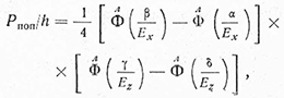 Вероятность попадания в прямоугольную деталь при наличии экрана высотой h при условии, что стороны прямоугольника параллельны главным осям рассеивания, центр прицеливания находится посредине видимой части цели (фиг. 1) и система­тические ошибки отсутствуют, определяется по формуле: