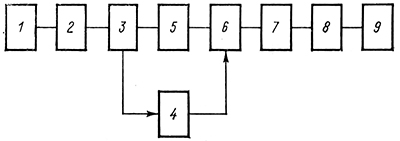Рис. 1. Блок-схема алгоритма расчета затрат мощности в гусеничном движителе и на преодоление внешнего сопротивления движению: 1 — ввод исходных данных; 2 — печать исходных данных; 3 — выбор расчетных формул в зависимости от типа шарнира; 4,5 — вычисление динамических затрат и затрат в шарнире гусениц с последовательным и параллельным типом шарнира соответственно; 6 — вычисление затрат в гусенице, на качение опорных катков, на преодоление сопротивления грунта; 7 — вычисление затрат в зацеплении, на преодоление сопротивления воздуха, затрат на валу ведущего колеса; 8—печать результатов расчета; 9 — окончание расчета