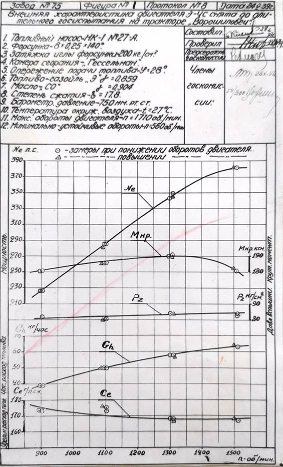 Изменение мощности по внешней характеристике соответствует обычной заводской регулировке двигателя В-2. Кривая крутящего момента несколько необычна, она имеет максимум при n=1300 об/мин. в то время ,как для обычного В-2 крутящий момент плавно возрастает до более низких оборотов (1000÷1100 об/мин.)