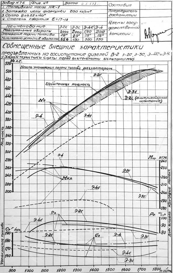 Совмещенные внешние характеристики дизелей В-2, Э2С, Э3С, 34С и Э4 предъявленных на госиспытания (перед испытаниями).