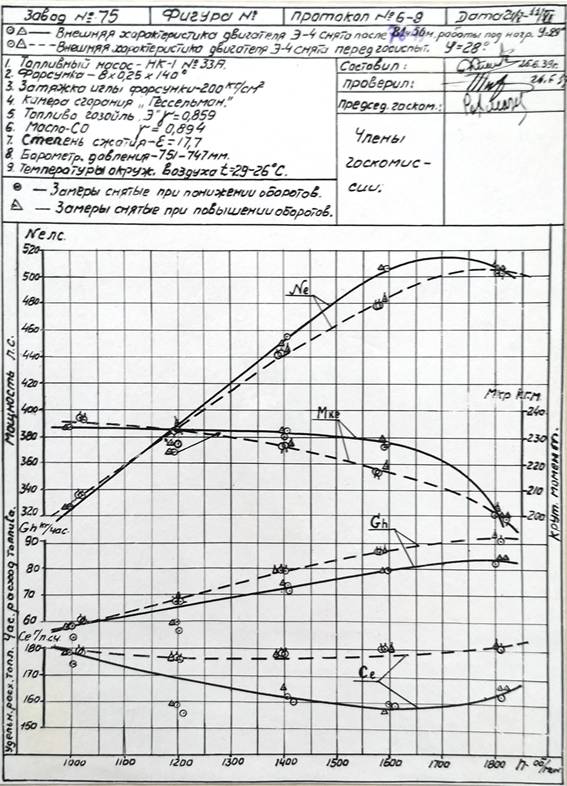 Первую заводскую обкатку и режимную приработку на стенде и 3-х часовые сдаточные испытания по программе для серийного двигателя Nе=500 л.с. при n=1800 об/мин. и проработал: под нагрузкой 7 часов 21 мин. на холостом ходу - 33 мин.